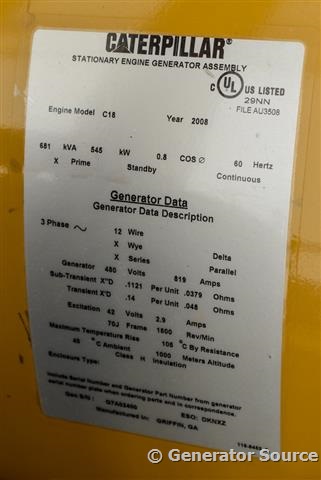 Description: Caterpillar 545 kW Diesel Generator Model #: LC7 Serial #: G7A02400 Year 2008, 244/480 Volt, 3 Phase, Prime 12 Wire, Open Skid Mounted