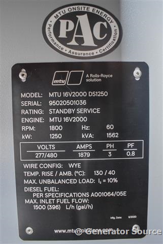 Description: MTU 1250 kW Diesel Generator Model #: 16V2000DS1250 Serial #: 95020501036 Year 2020, .50 Hours, 1879 Amps, 277/480 Volt, 3 Phase, Sound Attenuated Enclosure